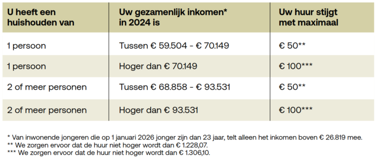 <p>De huur voor woningen in de sociale sector gaat elk jaar per 1 juli omhoog. De hoogte van de huurverhoging hangt af van je inkomen en de huurprijs die je nu betaalt. Bezwaar maken tegen de huurverhoging is mogelijk tot 1 juli 2026.</p>